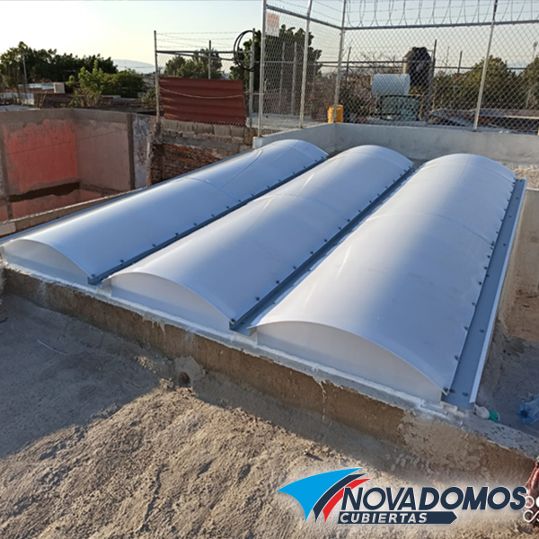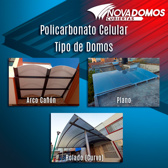 Domos de Policarbonato celular, estructurados o sobre canales de aluminio, los domos de policarbonato pueden ser tipo plano, tipo arco cañón, o tipo rolado . Los domos de policarbonato celular también pueden ser abatibles o corredizos en parte o su totalidad. El policarbonato celular es un producto rígido y ligero que lo convierte en el material ideal para realizar domos, en Novadomos utilizamos policarbonato celular de la mejor calidad solo marcas líderes del mercado Lexan, Poligal, PolNova, Etc. Para poder garantizar nuestros trabajos hasta por 10 años.